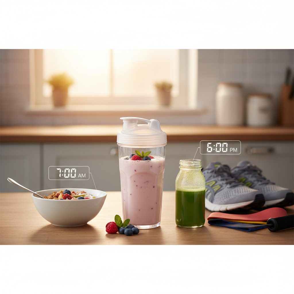 運動直後にシェイク: ジムや自宅でのトレーニング後、できるだけ早くプロテインを摂取しましょう。持ち運びが便利なシェーカーとプロテインパウダーを事前に用意しておくとスムーズです。水や牛乳で割るだけでなく、運動の種類や強度に合わせて糖質(バナナやスポーツドリンクなど)を一緒に摂ることで、インスリンの分泌を促し、アミノ酸の筋肉への取り込みをさらに促進できます。